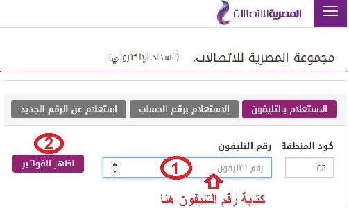 ثالثا : بعد ادخال رقم المنطقة والتليفون ، اضغط على زر (اظهر الفواتير) والموجود على الجانب الايسر من الصورة السابقة.