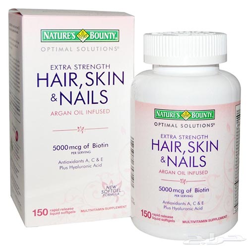 هير سكن اند نيلز كبسولات وهي كبسولات فيتامين غنية بالبيوتين مفيد للشعر والأظافر والبشرة، كما تحتوي على سيليكا وزنك ومصنع في الأساس في زيت جنين القمح وزيت الأرز وزيت الجزر من شركة ناتشرز باونتي.